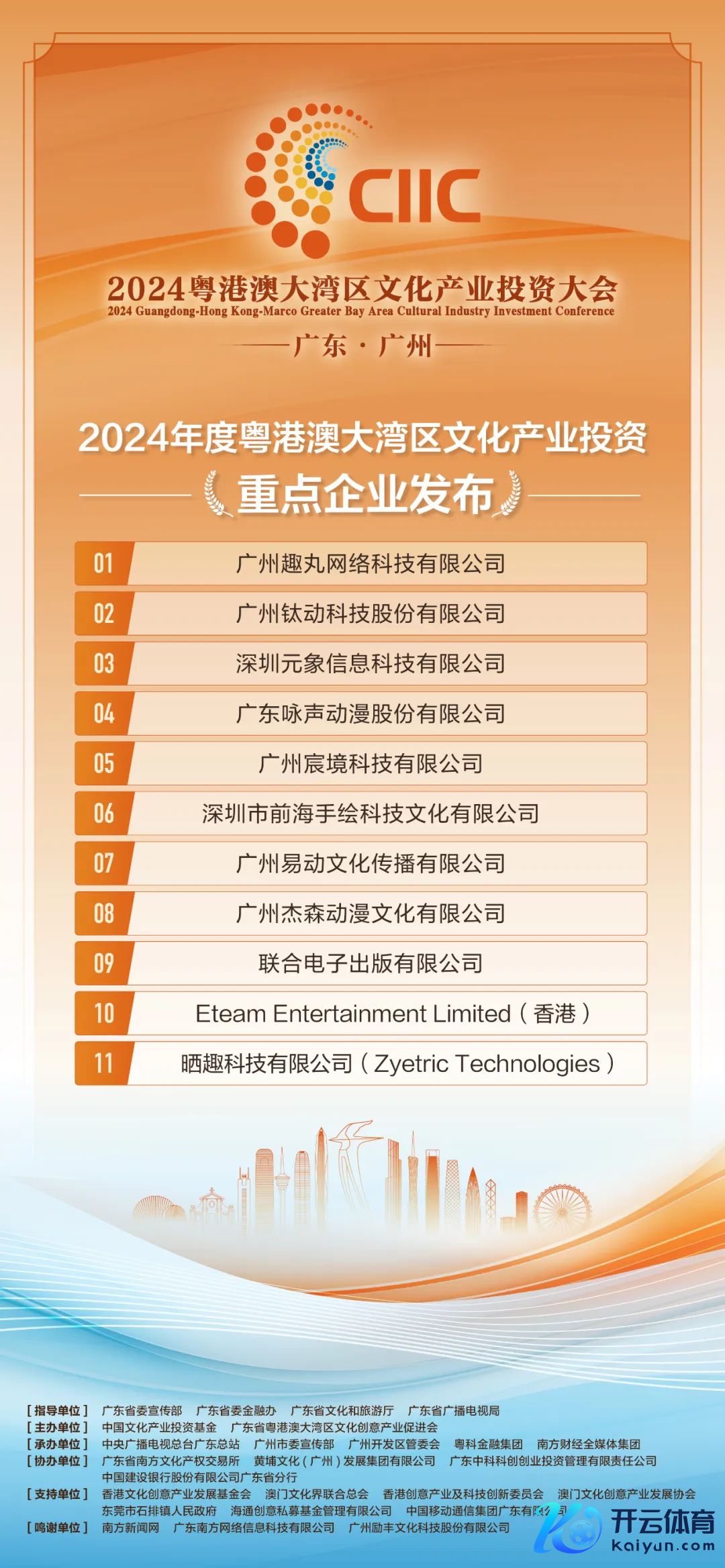 11月20日,2024粤港澳大湾区文化产业投资大会在广州召开,大会公布了“2024年度粤港澳大湾区文投榜单”,广州6家企业入选,包括广州趣丸荟萃科技有限公司、广州钛动科技股份有限公司、广东咏声动漫股份有限公司、广州宸境科技有限公司、广州易动文化传播有限公司、广州杰森动漫文化有限公司。