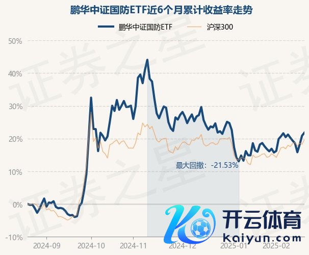 本站音书,2月21日,鹏华中证国防ETF最新单元净值为0.6894元,累计净值为1.3788元,较前一往改日高涨0.75%。历史数据闪现该基金近1个月高涨3.53%开yun体育网,近3个月下落5.91%,近6个月高涨21.8%,近1年高涨20.13%。该基金近6个月的累计收益率走势如下图: